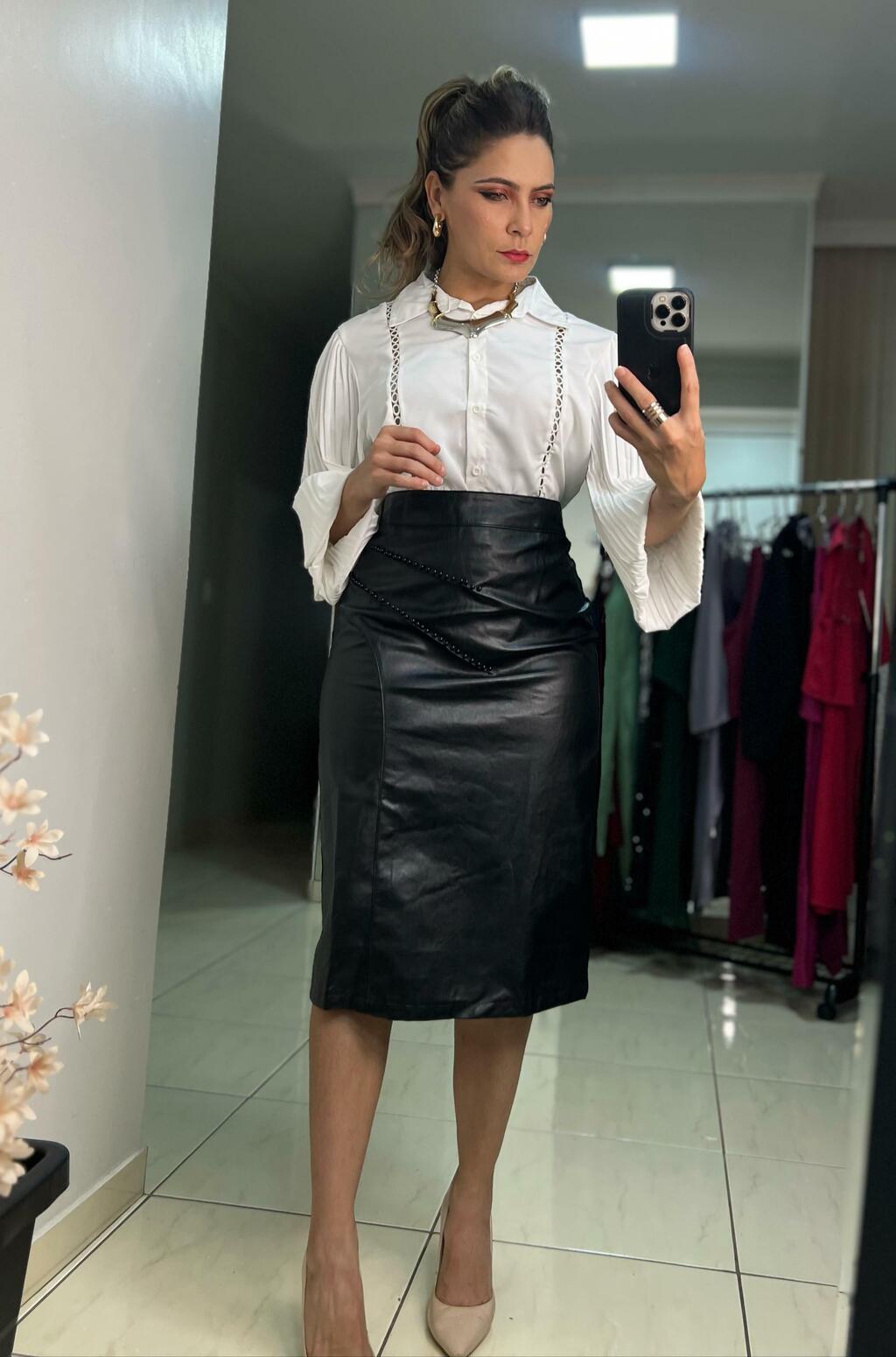 Lo más destacado son las mangas plisadas con volumen, que aportan modernidad y movimiento al look. El detalle del bies en los laterales realza el modelado y hace la pieza aún más especial.