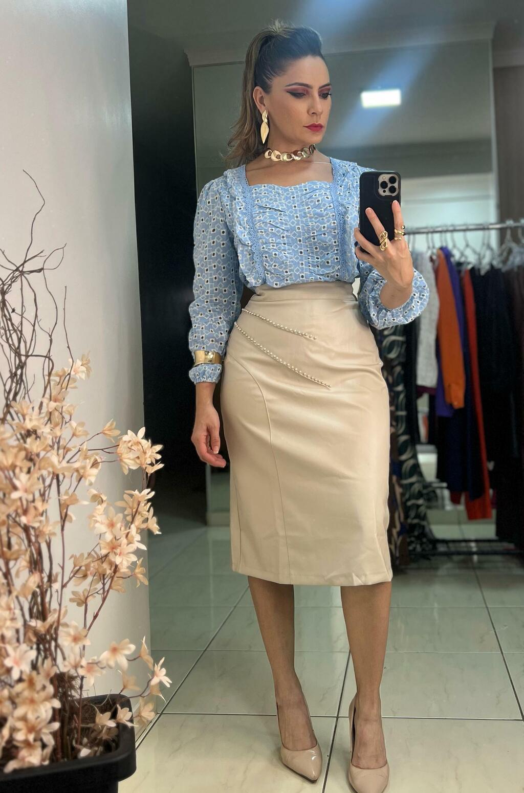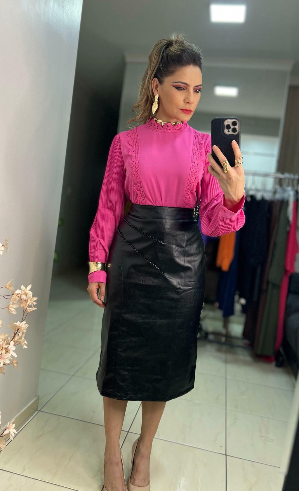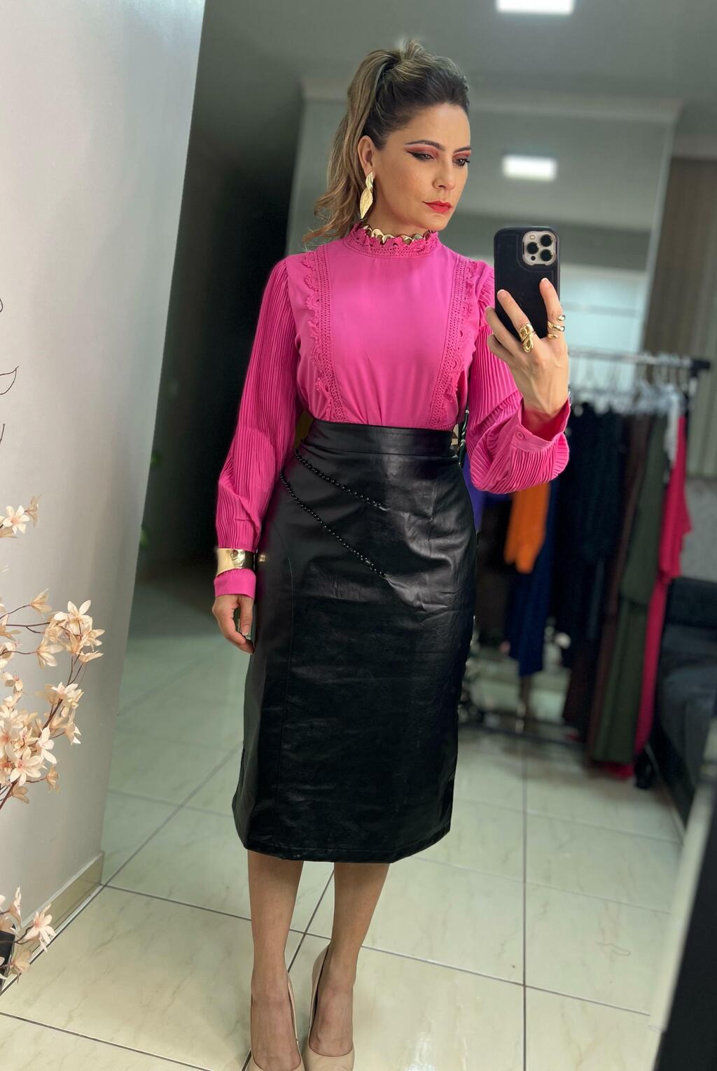 Uma peça sofisticada, versátil e cheia de personalidade! A saia midi em couro ecológico é aquele item que transforma qualquer look em segundos. Com recortes estratégicos e detalhes em pérola na parte frontal, ela entrega estilo com delicadeza. O zíper traseiro invisível garante um caimento impecável e moderno.