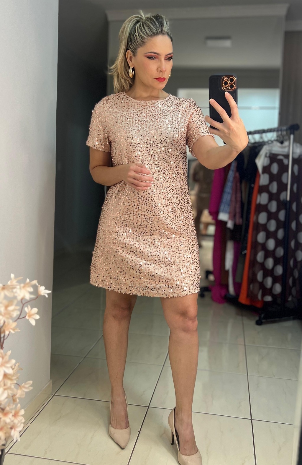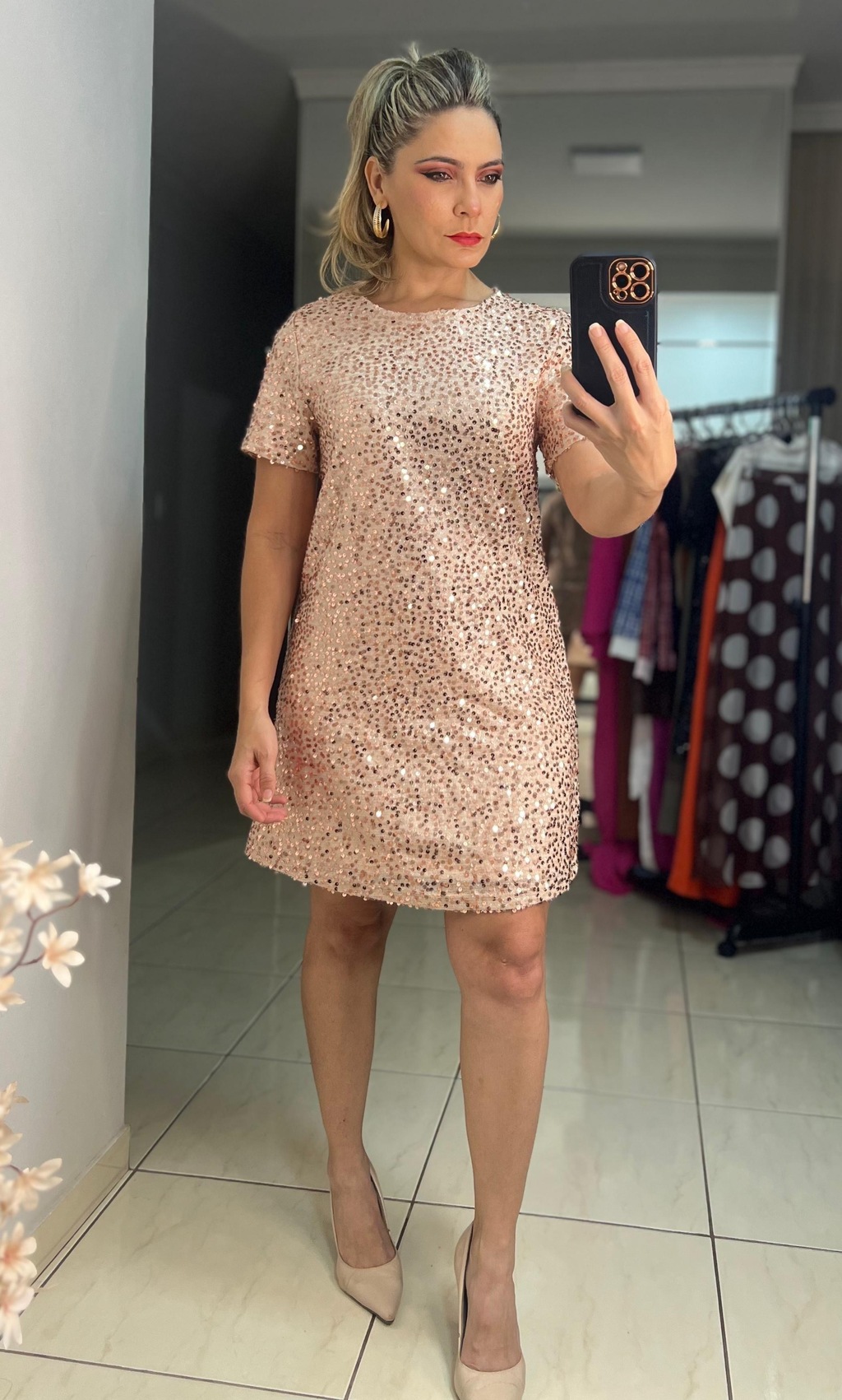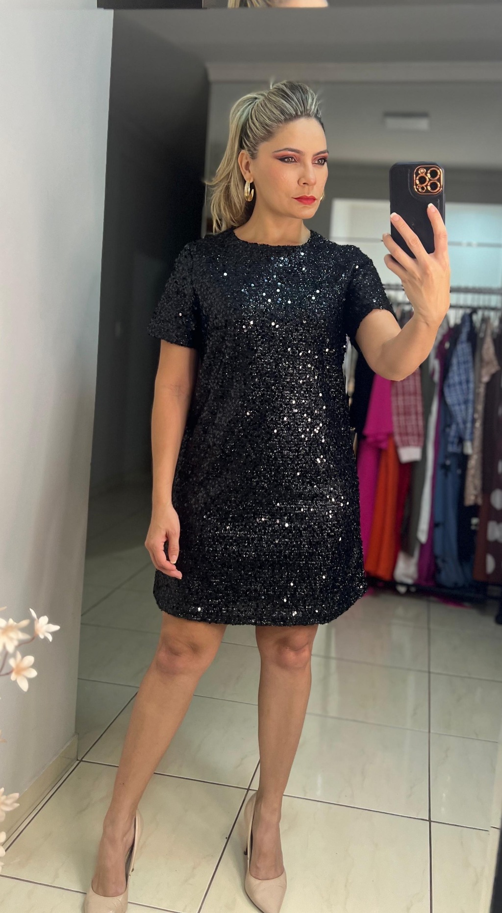 Brilla en cualquier ocasión con el Vestido Corto de Lentejuelas, una pieza que desprende glamour y sofisticación. Perfecto para eventos nocturnos, fiestas u ocasiones especiales, este vestido está completamente cubierto de lentejuelas que reflejan la luz, creando una apariencia deslumbrante y llamativa.