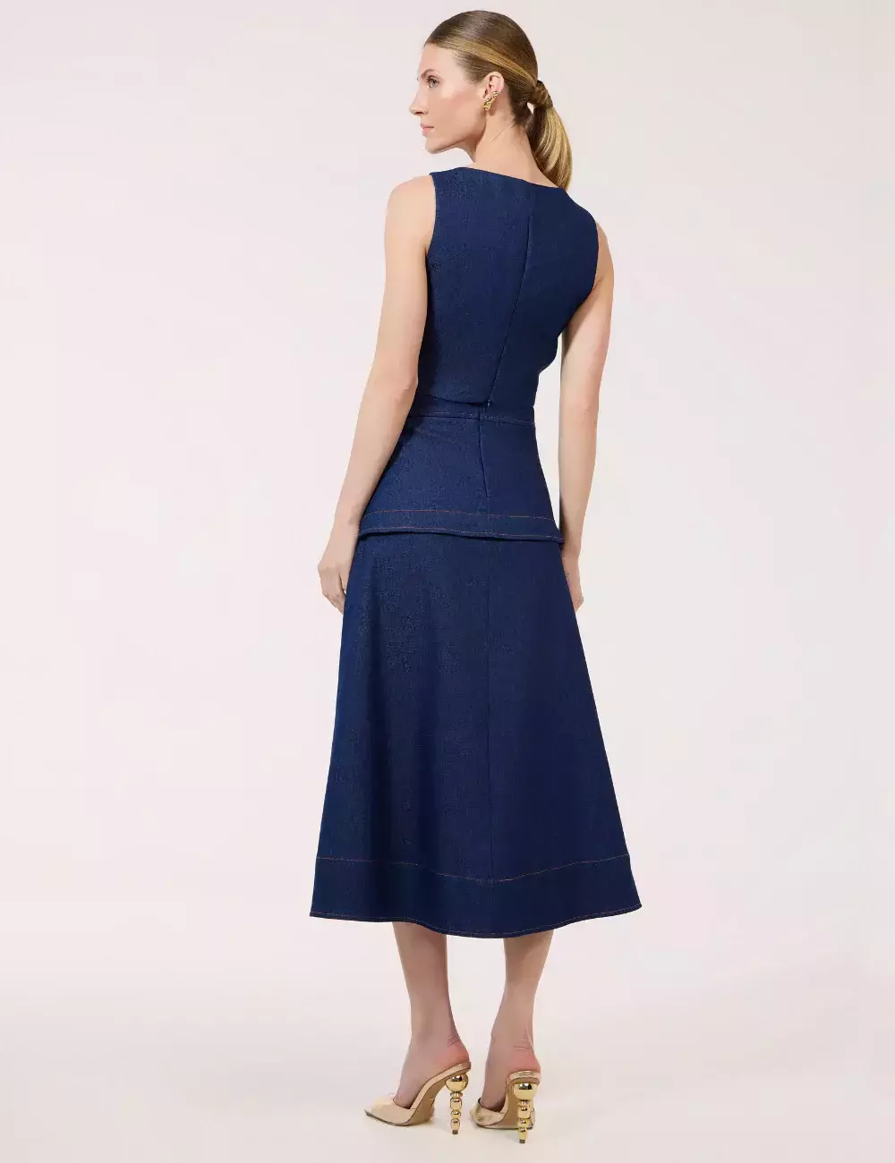 Os pespontos em contraste na cor laranja realçam o jeans e reforçam o acabamento. Possui fechamento por zíper invisível nas costas, garantindo praticidade e elegância.