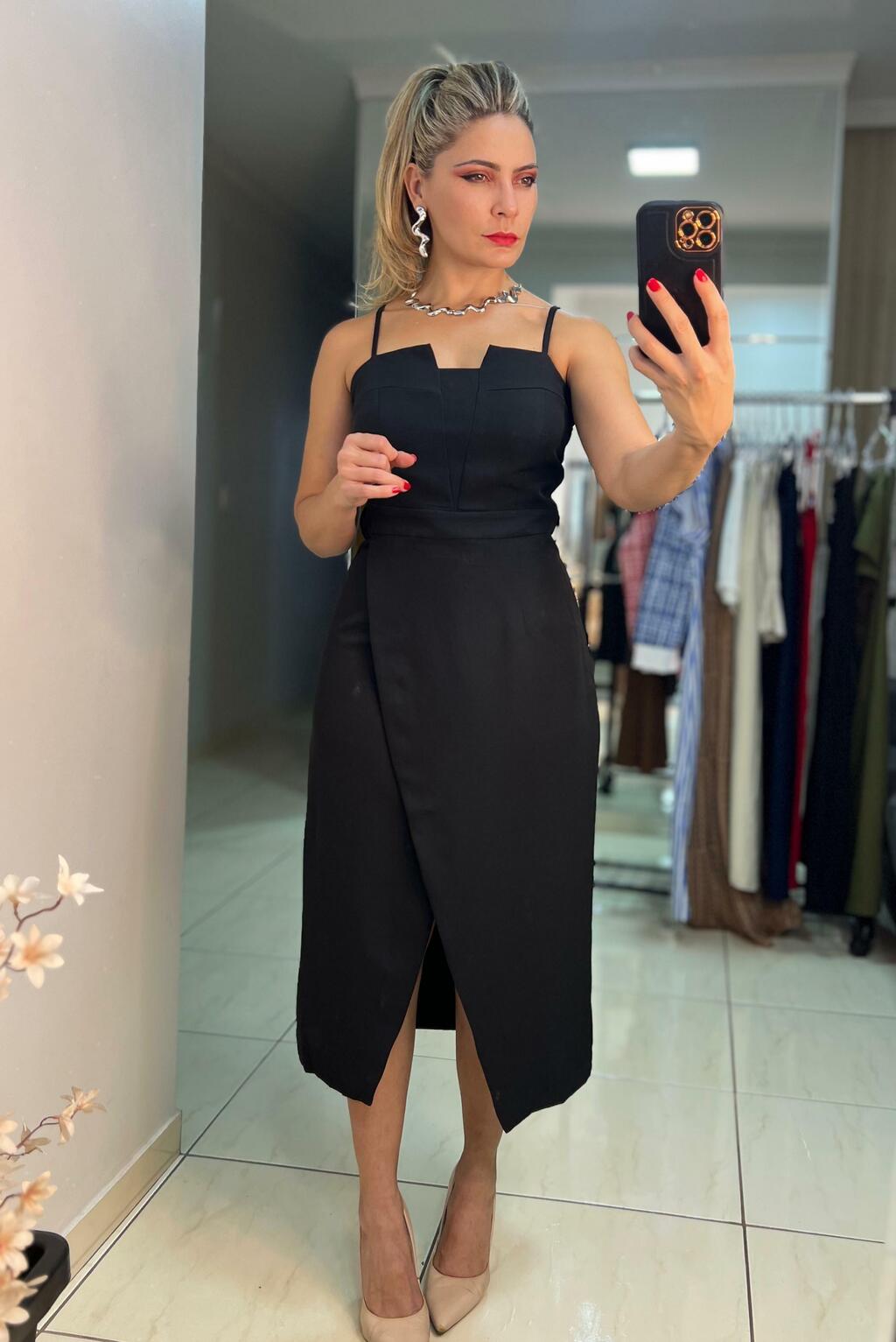 O vestido midi é confeccionado em crepe alfaiataria de alta qualidade, oferecendo um caimento impecável e toque sofisticado. Possui alças finas reguláveis, decote reto e detalhe transpassado na saia que valoriza a silhueta com charme e movimento. Ideal para eventos casuais, jantares ou ocasiões especiais em que você quer estar elegante e confortável.